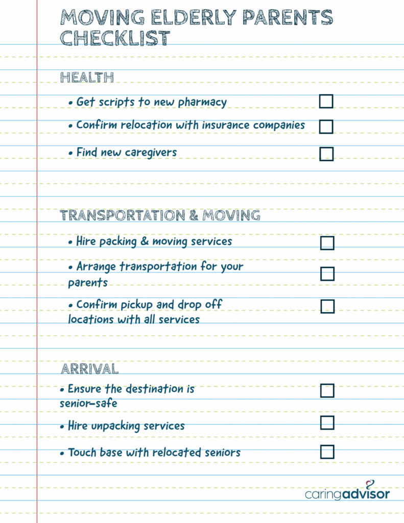 First things first: where will your loved ones be relocating to? Will they move into your home or a relative’s apartment? Their own space? A retirement community? The answer to this question will depend on a lot of different factors, such as budget and the level of care your loved one requires.